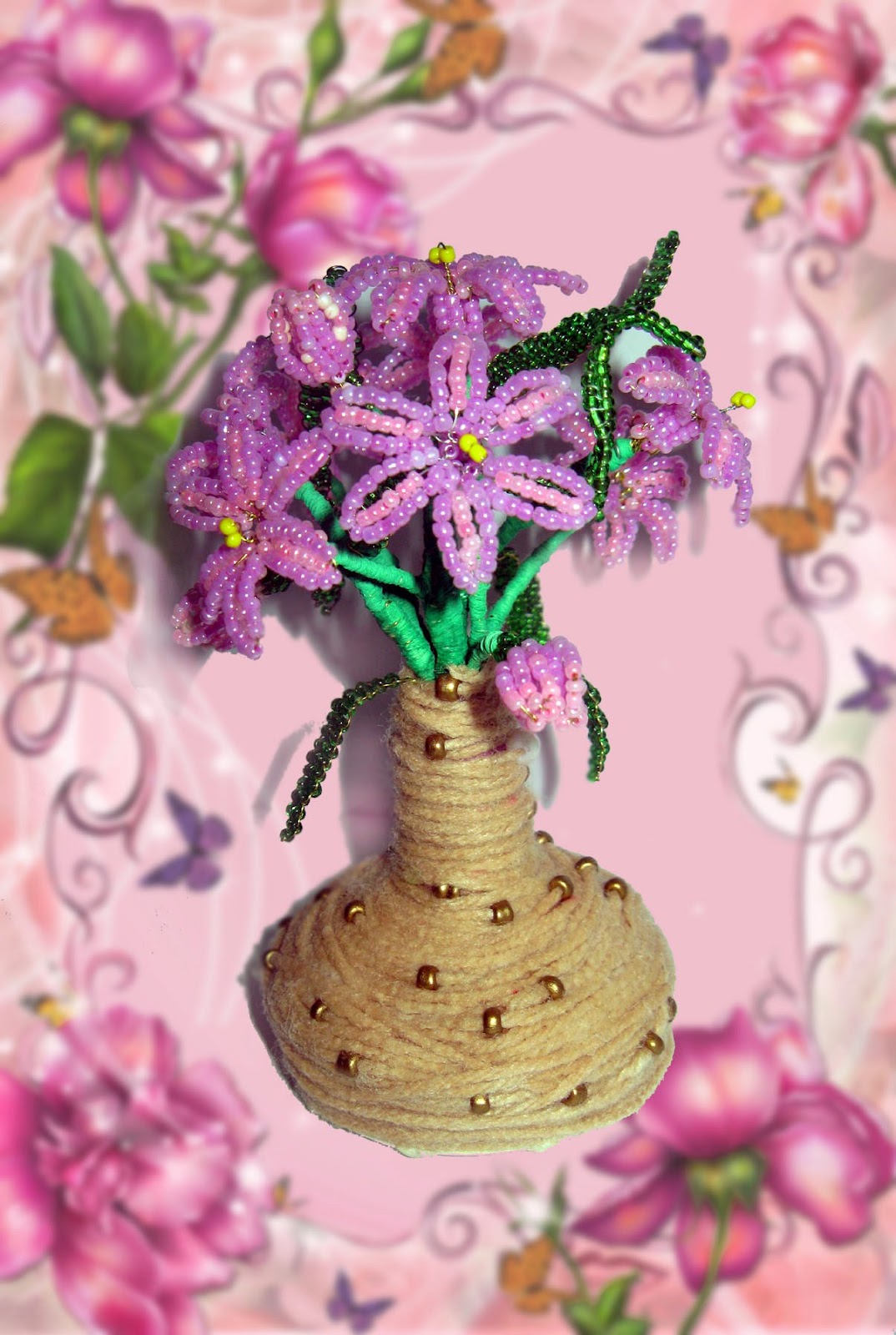 Вот такая интересная композиция у меня получилась. Сделала еще в феврале 2011 года.  Первые цветочки на проволке в технике фрнацузского плетения, - хотела из них сделать гиацинт, но терпения хватило сделать 11 цветков, и я собрала их в букетик. Основа "вазочки" из гипса, декорированная пряжей с бусинками.